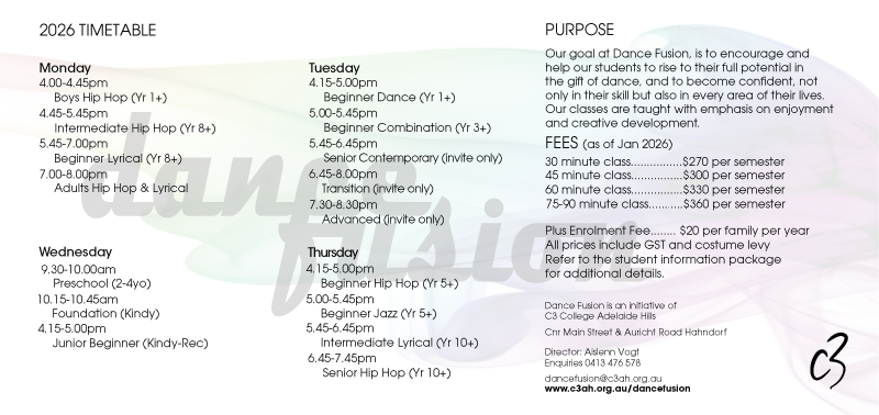 Our goal at Dance Fusion, (C3 College) is to encourage and help our students to rise to their full potential in the gift of dance, and to become confident, not only in their skill but also in every area of their lives. Our classes are taught with emphasis on enjoyment and creative development. We create a unique atmosphere where students are nurtured and encouraged to be the best person they can be!!